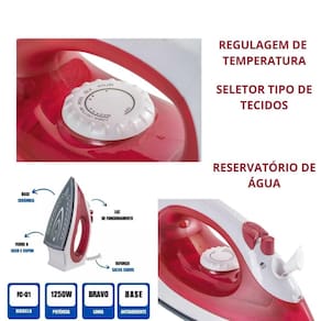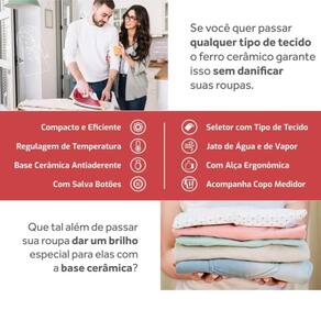 Benefícios: - Regulagem De Temperatura - Base Cerâmica Antiaderente - Ponta Salva - Botões - Seletor Com Tipo De Tecido - Jato De Água E Vapor - Alça Ergonômica