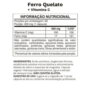 Cada cápsula contém uma dosagem precisa de ferro quelato, uma forma de ferro que é facilmente absorvida pelo corpo, evitando os desconfortos típicos de outras formas de ferro, como náuseas ou constipação. A vitamina C, por sua vez, é fundamental para o bom funcionamento do sistema imunológico e contribui para a regeneração da pele e tecidos do corpo. Juntas, essas substâncias ajudam a melhorar a oxigenação celular e aumentar os níveis de energia, proporcionando mais disposição e vitalidade para o seu dia a dia.