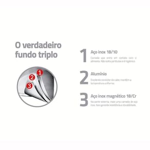 - O fundo triplo (aço inox + alumínio + aço inox) distribui o calor uniformemente, proporcionando um cozimento mais rápido e uniforme, economizando energia e deixando os alimentos aquecidos por mais tempo.