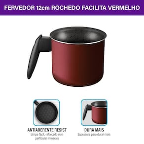 Linha Rochedo Facilita, com antiaderente Resist Limpa fácil, reforçado com partículas minerais: Dura mais. Com o Fervedor Rochedo Facilita Vermelha 12cm, você facilita seu dia a dia, com design moderno na cor vermelha, é o item perfeito para sua cozinha. Conheça todos os diferenciais dessa linha: