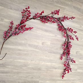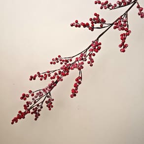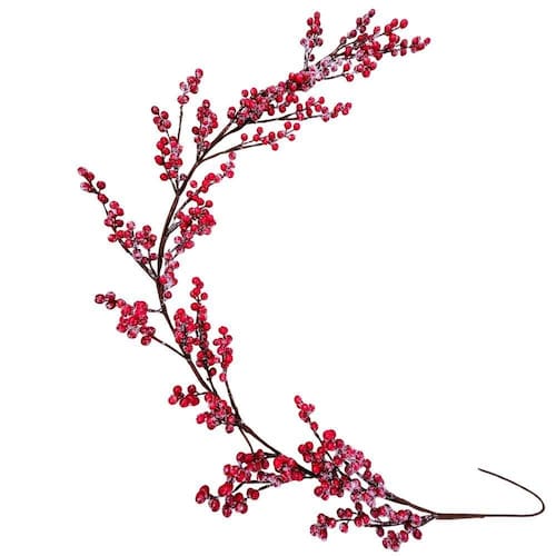 Decoração natalina festão aramado com bolinhas berry vermelhas nevadas.