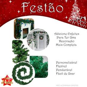 Este festão de Natal mede 2,7 metros de comprimento e apresenta um verde vibrante e natural, ideal para compor decorações natalinas elegantes e imponentes. A peça é confeccionada em estrutura aramada de alta qualidade, proporcionando maior firmeza e durabilidade, o que garante um formato bem definido e a possibilidade de modelagem personalizada. Detalhes dos galhos: O festão contém 240 galhos densos e texturizados, com folhas de tonalidade verde escuro, que contribui para uma aparência realista, semelhante aos ramos de pinheiro natural. Cada galho é articulado, permitindo que você os posicione da forma desejada, aumentando o volume em pontos estratégicos ou criando uma aparência mais ordenada. Essa flexibilidade possibilita que o festão se ajuste perfeitamente a diferentes superfícies e formatos, como em arcos, portas, janelas, lareiras, escadas, e até mesmo em estruturas suspensas. Versatilidade e decoração personalizada: Esse festão oferece uma base versátil para criação de composições natalinas personalizadas. Graças à sua estrutura aramada, é possível adicionar uma variedade de ornamentos e luzes, como bolas coloridas, laços, sinos, pinhas, flores de Natal e cordões de luzes LED, nenhum enfeite é incluso que ficam bem firmes e seguros. Além disso, o comprimento de 2,7 metros torna-o ideal para cobrir extensões maiores de forma uniforme e cheia, resultando em uma decoração impactante e duradoura. Ideal para decoração de interiores e exteriores: A peça é resistente o suficiente para ser Utilizado tanto em ambientes internos quanto externos, desde que protegida de intempéries severas. Perfeita para criar ambientes natalinos em casa, em escritórios, lojas ou áreas comerciais, essa peça permite que você crie cenários de Natal sofisticados, com o calor e a beleza das festas de fim de ano. O festão é a escolha ideal para quem deseja investir em uma decoração de Natal completa, personalizada e que esbanje elegância e espírito natalino.