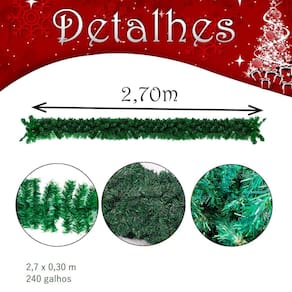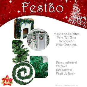 Este festão de Natal mede 2,7 metros de comprimento e apresenta um verde vibrante e natural, ideal para compor decorações natalinas elegantes e imponentes. A peça é confeccionada em estrutura aramada de alta qualidade, proporcionando maior firmeza e durabilidade, o que garante um formato bem definido e a possibilidade de modelagem personalizada. Detalhes dos galhos: O festão contém 240 galhos densos e texturizados, com folhas de tonalidade verde escuro, que contribui para uma aparência realista, semelhante aos ramos de pinheiro natural. Cada galho é articulado, permitindo que você os posicione da forma desejada, aumentando o volume em pontos estratégicos ou criando uma aparência mais ordenada. Essa flexibilidade possibilita que o festão se ajuste perfeitamente a diferentes superfícies e formatos, como em arcos, portas, janelas, lareiras, escadas, e até mesmo em estruturas suspensas. Versatilidade e decoração personalizada: Esse festão oferece uma base versátil para criação de composições natalinas personalizadas. Graças à sua estrutura aramada, é possível adicionar uma variedade de ornamentos e luzes, como bolas coloridas, laços, sinos, pinhas, flores de Natal e cordões de luzes LED, nenhum enfeite é incluso que ficam bem firmes e seguros. Além disso, o comprimento de 2,7 metros torna-o ideal para cobrir extensões maiores de forma uniforme e cheia, resultando em uma decoração impactante e duradoura. Ideal para decoração de interiores e exteriores: A peça é resistente o suficiente para ser Utilizado tanto em ambientes internos quanto externos, desde que protegida de intempéries severas. Perfeita para criar ambientes natalinos em casa, em escritórios, lojas ou áreas comerciais, essa peça permite que você crie cenários de Natal sofisticados, com o calor e a beleza das festas de fim de ano. O festão é a escolha ideal para quem deseja investir em uma decoração de Natal completa, personalizada e que esbanje elegância e espírito natalino.