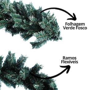 Transforme seus ambientes com a beleza e o volume deste festão natalino aramado verde, ideal para criar decorações elegantes e cheias de vida. Com 2,7 metros de comprimento e 23cm de largura, o modelo conta com 180 galhos, proporcionando um aspecto encorpado e natural.