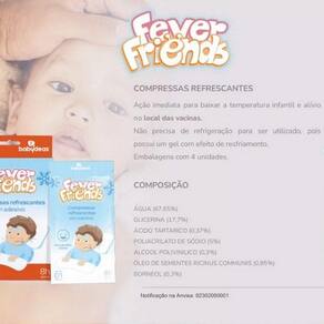 Super práticas para ter sempre na bolsa ou mala do bebê, prontas para usar e sem a necessidade de resfriamento, as compressas refrescantes Fever Friends auxiliam as mães na hora da febre, pois quando aplicadas na testa do bebê ou criança, elas agem fazendo com que a temperatura corporal diminua. A ação de Fever Friends permanece por até 8 horas. Fever Friends pode ser recortado e aplicado no local das vacinas, auxiliando na redução da dor e inchaço localizado.