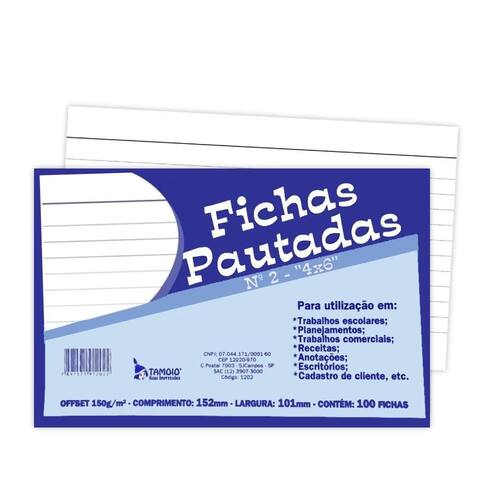 - Marca: Tamoio - Modelo: Ficha pautadas - Referência: 1202 - Contém 100 fichas - Cor: brancas - Com pauta - Gramatura: 150g/m - Dimensões: 15,2 x 101 cm LxA - Composição: papel off set Marca: Não Informado