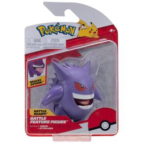 O recurso de ação integrado é ativado ao pressionar a estrutura da figura, fazendo com que a língua de Gengar se projete para frente, reproduzindo um ataque característico do personagem. O acabamento apresenta detalhes fiéis ao design visto na série animada Pokémon, com corpo em tom roxo, dentes aparentes e expressão facial característica do personagem. ? A figura é fabricada em plástico resistente, sem necessidade de baterias, indicada para crianças a partir de 4 anos e para colecionadores que buscam compor cenários com outros personagens da linha Battle Feature. Trata-se de um produto oficial licenciado da marca Pokémon, produzido pela Jazwares sob o código de modelo 95126.