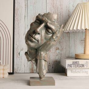 Material: Resina Tamanho: 15,5 x 11,2 x 28,3 cm Design abstrato emocional — Esta escultura apresenta um rosto masculino contemplativo apoiado nas mãos postas, expressando silêncio, consideração e profundidade emocional por meio de formas artísticas. Textura de bronze vintage — Com rachaduras realistas e um acabamento metálico envelhecido, esta estátua evoca uma elegância clássica e desgastada que aprimora os interiores modernos e rústicos. Construção durável em resina — Feito de resina premium, oferece a aparência de metal envelhecido com as qualidades leves e duráveis dos materiais modernos. Tamanho grande e impressionante — Medindo 15,5 x 11,2 x 28,3 cm, esta figura se destaca como peça central em mesas de console, prateleiras ou mesas de escritório, adicionando uma presença artística impactante. Decoração artística versátil — Perfeito para exibição em casa, estúdio ou comercial, este ornamento de figura é ideal para entradas, lounges, escritórios e arranjos em estilo de galeria.