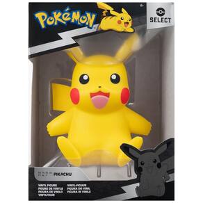 A peça é produzida em vinil rígido com acabamento liso e pintura em múltiplas cores, reproduzindo corpo amarelo, bochechas vermelhas, orelhas com pontas escuras, olhos expressivos e cauda em forma de raio. O produto é recomendado para maiores de 3 anos e integra a linha Select de figuras em vinil, voltada a fãs que desejam compor equipes de Pokémon em escala semelhante.