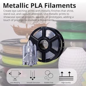 - Prestígio para projetos: adicione um toque de prestígio aos projetos e prêmios estudantis com o filamento PLA de esboço da série de cores metálicas MakerBot em prata cintilante