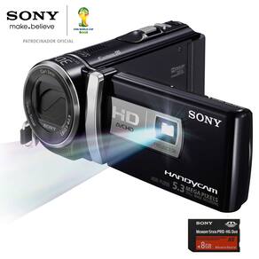 A HDR-PJ200 já vem acompanhada de um cartão de memória flash (Memory Stick PRO-HG Duo) de 8 GB. É nele que você gravará as suas filmagens e também as fotografias tiradas com o recurso de foto de até 5,3 megapixel de resolução.