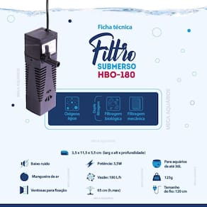 Ficha técnica: Marca: HBO Modelo: filtro interno HBO-180 Potência: 3.5W Vão: 180 L/h Voltagem: bivolt Hmax: 65cm altura máxima que a bomba consegue elevar a água Indicado para aquários de até: 36L Medidas: 3,5 x 11,5 x 5,5 cm larg x alt x profundidade Tamanho do fio: 120 cm Peso: 125g