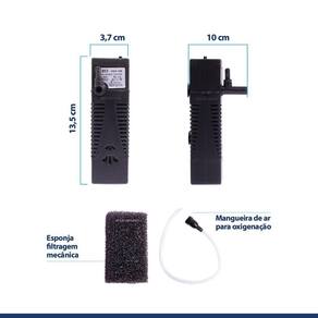 Características: Filtro esponja biológica propicia o crescimento de bactérias para filtragem biológica Dupla filtragem: mecânica e biológica Silencioso Baixo consumo de energia Seguro e confiável Possui ventosas para fixação Melhor custo benefício da categoria Acompanha mangueira de ar para auxilio na oxigenação O filtro necessita ficar totalmente submerso Serve para aquário marinho e de água doce