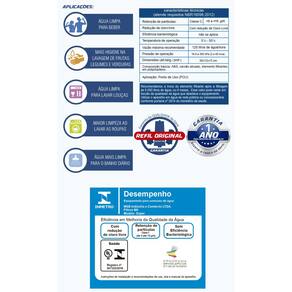 Filtro para ponto de uso, medidas, elemento em polipropileno com carvão ativado. Proporciona uma retirada de partículas de 5 micras com remoção de cloro da água, tornando a água da rede limpa e pura para o consumo. Vida útil de 6000 litros.