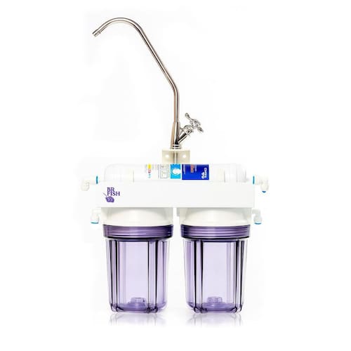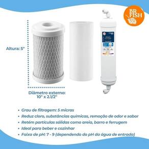 Filtro de água para torneira com 3 estágios de filtragem: polipropileno, carvão ativado em bloco e elemento filtrante alcalino. Reduz cloro, odores e sabores, retém partículas sólidas e alcaliniza a água. Inclui carcaças, mangueiras, conectores e torneira.Bica móvel