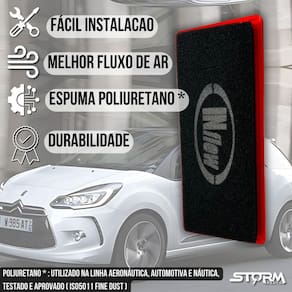 Filtro ar inflow citroen ds3 motor 1.6 thp turbo 2012 a 2015 Características: - desenhado para melhorar a eficiência do veículo; - não descartável lavável e 100% reciclável; - vida útil de 2 anos ou 60.000km; - redução da emissão veicular; - redução na quantidade de trocas de filtro de ar convencional de papel ecologicamente correto ; - espuma poliuretano performance de filtro ar esportivo ; - não sofre com ação de umidade e chuva; - óleo utilizado: óleo mineral vaselina líquida neutra - modelo urbano, podendo ser utilizado em ruas de terra com manutenção antecipada. Na utilização por longos períodos em estradas não pavimentadas, as condições de limpeza do filtro devem ser avaliadas a cada 5 mil km. Compatível com: Citroen ds3 motor thp 1.6 turbo Itens inclusos - 01 filtro de ar esportivo - 01 manual - 01 adesivo decal inflow - 01 adesivo caixa de ar - 01 termo de Sobre o filtro: Melhore a eficiência do seu veículo com os filtros inflow. Feito especialmente de poliuretano, um material filtrante já consagrado em mercados como o europeu, americano e asiático, os filtros inflow aperfeiçoam a entrada de ar no motor, proporcionando uma melhor combustão e consequentemente diminuindo o consumo de combustível. Pelo histórico de todos os testes realizados em outros veículos, os resultados sempre são muito parecidos, ou seja: filtro novo inflow x filtro novo papel = ganho de 2 a 3% em potência. Com o passar do tempo, os demais filtros começam a ficar restritivos, aumentando significativamente essa %, podendo chegar a 10% essa restrição não ocorre com o inflow em função da característica das células, em formato de dodecaedro, que retém a poeira que fica grudada no óleo que é aplicado no filtro, mantendo por um tempo muito maior, o funcionamento do motor em sua plenitude de potência. Quando fazer a manutenção Depende do uso. Examinar o elemento filtrante a cada 5.000 km e periodicamente em condições severas de poeira. Quando em condições de utilização em áreas urbanas, geralmente 01 vez ao ano ou 15.000 km o que chegar primeiro , no mínimo. Principais perguntas: P. Necessita adaptação para instalar P. Acusa algum erro no painel do carro P. Qual a condição do produto R. Vendemos somente produtos novos e lacrados P. Acompanha oleo de manutenção R. Filtro já vem com oleo aplicado, porem não acompanha oleo adiconal para as futuras manutenções oleo adquirido a parte Obs: apesar de simples instalação orientamos que a instalação seja feita por um profissional.