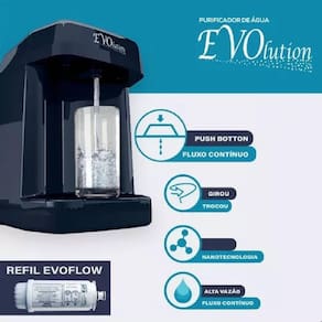 Filtro Purificador evolution de água natural possui nanotecnologia contra bactérias e certificação inmetro - O purificador evolution é perfeito para quem quer praticidade- Não utiliza energia elétrica- Refil girou trocou- Fácil instalação- Purificador de água naturalConta com nanotecnologia que evita proliferação de bactérias em contato com paredes do filtro, dolomita para regular o ph da água e carvão ativado que reduz o cloro. Elimina odores e gosto ruim da águaCaracterísticas técnicas da filtragem de água do refil evoflow:Vida útil: 3000 litros ou 6 mesesPressão máxima: 70 mca 700kpa Pressão mínima: 2,5 mca 25 kpa Vazão: 60 litros/horaEnsaios de desempenhoEficiência da retenção de partículas: classe cEficiência da redução de cloro livre: aprovadoEficiência bacteriológica: não se aplicaEnsaios realizados de acordo com a nbr 16098:2012Conta com vários benefícios para a sua famíliaPush bottom.Alta vazão.Gabinete em plástico de alta resistênciaMedidas do purificador: 28,3 cm de altura e 20 cm de largura, e 20 cm de profundidadeEconomia: purifica até 3.000 litros de água com um único filtro ou até 6 meses de uso para troca do refilPeso do purificador: 1,2 kg- ítens inclusos:- 1 purificador evolution- 1 refil evoflow já instalado - 1 mangueira para alimentação da rede de água- kit para instalação em parede parafusos / bucha e suporte plástico - Manual do usuário
