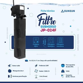 Filtro Sunsun JP-024F interno submerso filtragem mecânica e biológica - 1200L/h para aquários de até 240L Acompanha 60g de mídia filtrante anéis de cerâmica. Os filtros submersos Sunsun, são ideais para quem busca um equipamento prático, de fácil manutenção, confiável e de ótimo custo-benefício, possui entrada de mangueira de ar para auxilio na oxigenação da água, realiza dois tipos de filtragem, biológica e mecânica. Características: Baixo consumo de energia Dupla filtragem Filtro esponja propicia o crescimento de bactérias para filtragem biológica e mecânica Auxilia na oxigenação Silencioso Resistente Possui ventosas para fixação Refil de fácil Ótimo custo benefício Acompanha mangueira de ar para auxilio na oxigenação Saída de água tipo bico - esse modelo não acompanha flauta O filtro necessita ficar totalmente submerso Serve para aquário marinho e de água doce Compre nesse anúncio diretamente com um revendedor oficial Sunsun no Brasil. DICAS: 1 - É possível adicionar mídias filtrantes dentro do copo do filtro, basta cortar um pedaço da esponja e adicionar carvão ativado, anéis de cerâmica, perlon, purigen, OceanPure entre outras. Basta atentar-se ao peso do filtro, as mídias não devem passar de 250g. 2 - Para manter um bom desempenho da bomba, realize a limpeza da bomba e das esponjas a cada 7 dias. Lavar apenas com água corrente. Especificações técnica: Marca: Sunsun Modelo: Sunsun JP-024F Potência: 22W Vazão: 1200 L/h Voltagem: Escolha a voltagem no botão próximo ao botão de compra. Hmax: 1.6m altura máxima que a bomba consegue elevar a água Indicado para aquários de até: 240L Medidas: 6 x 32,5 x 11 cm larg x alt x profund Tamanho do fio: 140 cm Peso: 550g Itens inclusos na embalagem: 1 Bomba Sunsun 1 Filtro com 2 esponjas 1 Mangueira de ar silicone 60g de anéis de cerâmica Fotos e textos registrados. Todos os direitos reservados apenas a esse vendedor e a seus parceiros devidamente autorizados.