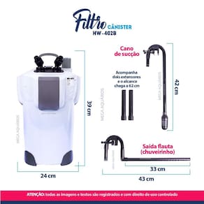 Características: Pressurizado, ou seja, é possível retirar o ar de dentro do filtro o que resulta na potencialização da filtragem e a não perda de vazão da bomba Saída tipo flauta chuveirinho que aumenta a oxigenação da água Três camadas de filtragem com a possibilidade de realizar a filtragem mecânica, biológica e química de acordo com as mídias inseridas Uso externo Silencioso Resistente Peças para reposição de fácil acesso Melhor custo benefício do mercado Serve para aquário marinho, plantado, de água doce e lago Acompanha perlon em cada cesta Não acompanha outras mídias filtrantes