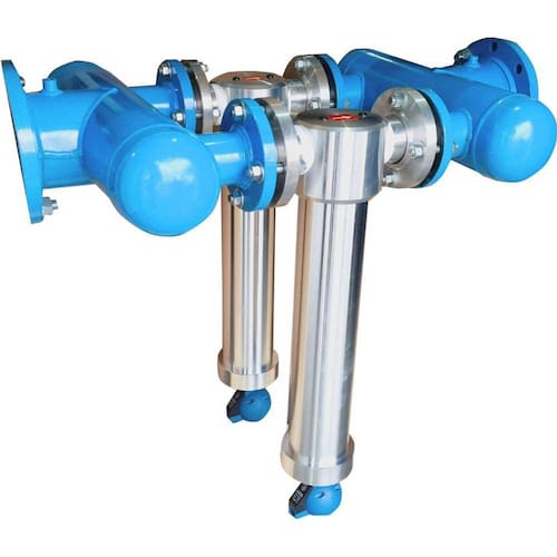 Filtro Coalescente Pré, Vazão até 3.800 pcm (107,6 m3/min), Pressão até 16 bar e Rosca Flangeada de 6". Acompanha elementos coalescentes, purgadores boia magnético e manômetro diferencial de pressão.