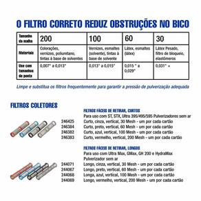 Use o filtro do manifold maximiza o desempenho da pulverização, economizando tempo e dinheiro ao estender a vida útil do seu equipamento e reduzir o tempo de inatividade. Use malha mesh 30 para materiais como látex pesado, enchimento de bloco ou elastomérico.