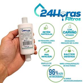 Filtro Compatível Igatu 731 Rosca 1/2 Multiuso 60l/h Pressão Filtro 24H-MULTI12 Compatível Igatu 731 Rosca 1/2 Multiuso 60l/h P/ap Por Pressão, Purificador de Água Universal. - Filtro Universal com Roscas de 1/2 na entrada e saída. - Pequeno: Cabe em qualquer lugar, de baixo da pia, etc. - Fácil adaptação em qualquer ponto de água, bebedouro, torneira, máquina de lavar, máquina de café, máquina de gelo, etc. - Pode ser como pré filtro de outro purificador, maximizando a eficiência da filtragem. - Longa duração: Filtro deve ser trocado de 6 a 6 meses. - O filtro elimina: Cloro, Gostos, Cheiros, Partículas Sólidas e ajuda a Elevar o pH. As marcas e produtos citados e ilustrados são propriedades de seus respectivos fabricantes e aparecem apenas para demonstrar a compatibilidade deste produto. --------------------------------------------------------------------------- Marca: 24 Horas Filtros Eficiência da retenção de partículas: Classe III Eficiência da redução de Cloro livre: Aprovado Eficácia Anti-Microbiana 96%: Aprovado Produto de acordo com a norma ABNT NBT 16098:2012. Elemento filtrando destinado ao uso em água que atenda a portaria N 2.914 do Ministério da Saúde. Marca: Não Informado Ean: 7892449405651