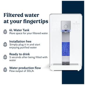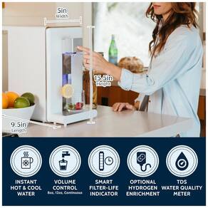 É possível ter água instantânea quente, fria ou em temperatura ambiente, ideal para café ou chá. Indicadores inteligentes de vida útil do filtro e display TDS Total de Sólidos Dissolvidos fornecem qualidade da água em tempo real. Possui ainda uma função opcional de enriquecimento de hidrogênio molecular. A bandeja coletora é removível para copos e garrafas de todos os tamanhos e fácil limpeza.