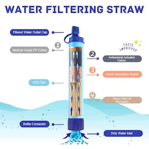 Cada canudo de filtro de água apresenta um design para garantir que a água esteja livre de impurezas e segura para beber. Sistema de filtragem incluindo carvão ativado e membranas de ultrafiltração de fibra. que pode remover 99,9999% da poluição de substâncias nocivas, odor, cloro e produtos químicos orgânicos, etc. ).