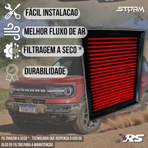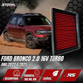 Filtro de ar esportivo ford bronco 2.0 16v turbo 2022 a 2025 A função do filtro de ar esportivo é semelhante a um filtro de ar padrão, porém o diferencial é o alto fluxo de ar, assim seu motor vai admitir mais ar para a câmara de combustão. Proporcionando uma melhor queima de combustível, gerando melhor eficiência energética menor consumo de combustível e aumento de potência além é claro de sua vida útil muito superior ao filtro tradicional de 100 mil km Durabilidade 10x maior que o filtro tradicional Seu motor trabalhando melhor devido ao maior fluxo de ar Compatível com: Ford maverick 2.0 16v turbo ano 2022 a 2025 Lariat Ford bronco 2.0 16v turbo ano 2022 a 2025 Sport wildtrak Mais detalhes. - marca: rs filter - : 100 mil km - tecnologia de filtragem a seco não uso óleo para manutenção - material: 8 micro camadas de poliéster não usa papel tnt - lavável e reutilizável - retém completamente a entrada de poeira Acompanha: - 01 filtro de ar esportivo - 01 manual de lavação - 01 termo de - 01 chaveiro premium - 02 adesivos Performance: - o desenvolvimento do filtro esportivo é focado para fornecer um fluxo de ar mais elevado, garantindo maior passagem de ar para o motor. - ao utilizar o filtro esportivo rs, o seu veículo receberá a melhor tecnologia e performance Benefícios: - o grande diferencial é o equilíbrio entre o alto fluxo de ar com excelente filtragem, sendo um item indispensável para quem deseja maior rendimento do combustível Sustentável: Principais perguntas: P. Necessita adaptação para instalar P. Acusa algum erro no painel do carro P. Qual a condição do produto R. Vendemos somente produtos novos e lacrados Obs: apesar de simples instalação orientamos que a instalação seja feita por um profissional. Quem somos: - somos a storm parts, trabalhamos com peças automotivas de alta qualidade e com , queremos que você e seu carro tenham a melhor experiência, por isso selecionamos cuidadosamente todos nossos produtos, os produtos da storm parts são a melhor opção para quem busca qualidade e confiança a um preço justo. - tenha tranquilidade de comprar com quem está disposto a oferecer o melhor atendimento, caso precise de ajuda antes ou após a compra, conte com a nossa equipe de atendimento para lhe ajudar. Marca: Não Informado