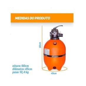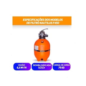 O Filtro de Areia é responsável por manter a água da piscina sempre limpa e cristalina, removendo impurezas e partículas com alta eficiência. Modelo ideal para piscinas residenciais e comerciais. Compatível com sistemas da Nautilus. Especificações Técnicas- Modelo: F450P - Capacidade: até 52.000 litros - Material: Polietileno de alta resistência - Válvula: 6 vias - Sistema de filtragem com areia especial para piscina Diferenciais- Alta eficiência na filtragem - Estrutura resistente e anticorrosiva - Fácil operação com válvula seletora 6 vias - Baixa necessidade de manutenção - Equipamento durável e confiável Funções da Válvula 6 Vias- Filtrar - Retrolavar - Enxaguar - Drenar - Recircular - Fechar Conteúdo da Embalagem- 01 Filtro de Areia - 01 Válvula seletora 6 vias areia filtrante não inclusa Atençãoverifique compatibilidade com a motobomba da piscina antes da compra. Recomendamos instalação por especializado. Embalagem reforçada Tenha água sempre limpa, cristalina e pronta para uso. Cobrimos qualquer do mercado