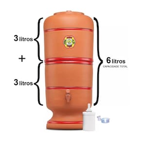 Filtro de barro com capacidade total de 6 litros (3L superior + 3L inferior), feito à mão em argila, reduz impurezas, água fresca e saudável.Bica móvel