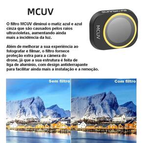 Filtro de lente mcuv para drone dji mini 4 pro Filtro de lente mcuv para drone dji mini 4 pro Com o filtro mcuv da sunnylife feito especificamente para o dji mini 4 pro, você conseguirá melhorar ainda mais a qualidade das suas fotos e vídeos, pois ele reduz a quantidade de luz e permite com que a câmera selecione o valor de exposição correto, evitando a superexposição. Além disso, o filtro mcuv diminui o matiz azul e azul cinza que são causados pelo raio ultravioleta, aumentando ainda mais a incidência da luz. Além de melhorar a sua experiência ao fotografar e filmar, o filtro também fornece proteção extra para a câmera do drone, pois a sua estrutura é feita de liga de alumínio, com design antiderrapante para facilitar ainda mais a instalação e a remoção. Também conta com revestimento multicamada de dupla face que garante um protetor à prova d&39;água, à prova de óleo, à prova de poeira e anti-riscos de primeira classe, dando a você a liberdade de experimentar diferentes possibilidades criativas Principais vantagens: - fácil instalação - fácil remoção - material resistente - proteção extra Modo de usar: 2. Alinhe com os orifícios e gire o filtro no sentido horário 3. Pronto Dados técnicos: Marca: sunnylife Modelo: n4p-fi721 Material: alumínio + vidro óptico Peso: 0.7g Compatibilidade: Compatível com drone dji mini 4 pro Itens inclusos: 1x filtro de lente mcuv 1x caixa de transporte Drone não incluso Imagens meramente ilustrativas de 90 dias após o recebimento do produto Esta é válida para todo o território nacional, e ela cobre defeitos de fabricação. Para maiores informações consulte o site do fabricante ou contate-nos pelos nossos canais de atendimento. Por que comprar seu equipamento com a proaventura Marca: Não Informado