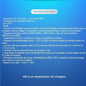 Quantidade de Tomadas: 5 tomadas (2P+T) + 3 entradas USB