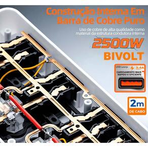 O cabo de alimentação possui design 33% mais espesso, com interno em cobre niquelado de alta condutividade, resultando em menor resistência e melhor condutividade elétrica. Com aproximadamente 2 metros de comprimento, amplia o alcance de uso. O espaçamento entre as tomadas é amplo, adequado para vários tipos de plugues, facilitando a inserção e remoção.