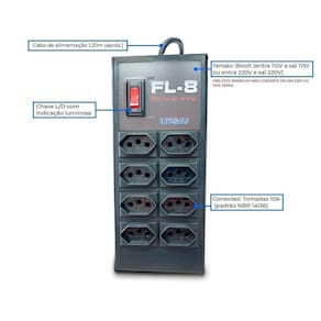 Filtro de linha com protetor de tensão 8 Tomadas Com Fio Fabricados em gabinete plástico injetado de alto impacto possuem design moderno e proporcionam proteção aos equipamentos eletroeletrônicos em geral, estão disponíveis em diversas configurações de tomadas. Aplicações: - Residência - Eletroeletrônicos - Informática - Áudio e vídeo - Eletrodomésticos - Vídeo Game Aplicações Típicas - Informática - Periféricos - Telefonia - Segurança - Aparelhos eletro-eletrôicos em geral. ATENÇÃO: A tensão de entrada do protetor é igual à tensão de saída. O protetor não transforma a tensão de 220V para 115V ou vice-versa. Destaques: - Bivolt - Chave L/D com indicação luminosa - Elementos de filtragem Características Técnicas: - Potência Máxima: 1150VA/W em 115V ou 2200VA/W em 220V - Tensão: Bivolt entra 115V e sai 115V ou entra 220V e sai 220V - Corrente máxima: 10 A por tomada ou 10 A no conjunto - Freqência: 50 / 60 Hz - Conexões: Tomadas 10A e Cabo de alimentação com plugue / 1,20m apróx. padrão NBR 14136 - Gabinete: Plástico ABS : 12 meses por defeito de fabricação Características Tensão: Bivolt entra 115V e sai 115V ou entra 220V e sai 220V Corrente máxima: 10 A por tomada ou 10 A no conjunto Conexões: 10A e com plugue padrão NBR 14136 Comprimentos do cabo: 1,20m aprox : 12 meses por defeito de fabricação Ean: 7898172116796