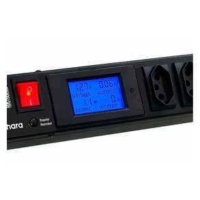 O display luminoso integrado oferece leitura clara de informações essenciais como voltagem, corrente, carga e consumo, além de permitir a programação personalizada de alertas de sobrecarga, um diferencial que o monitoramento em tempo real.