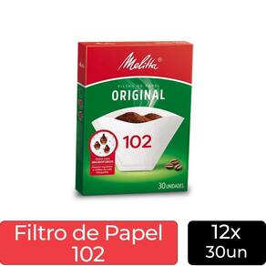 Formato 102, ideal para coadores e cafeteiras de mesmo tamanho Papel de alta resistência, não rompe com facilidade Estrutura porosa que retém o pó, mas deixa passar os sabores Produto biodegradável e descartável Embalagem econômica com 30 unidades Escolha de quem entende de café
