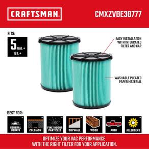 CRAFTSMAN CMXZVBE38777 Filtro de vácuo de substituição HEPA Media Wet Dry Vacuums para a maioria dos aspiradores CRAFTSMAN Shop de 5 a 20 galões, fácil instalação e retém alérgenos, pacote com 2 - O que está incluído: 2 filtros de mídia HEPA - Serve em: 19 litros. até 20 galões Aspiradores artesanais feitos em 1988 e depois - Filtragem eficaz: somente captador seco – retém pólen e alérgenos comuns como pelos de animais de estimação, mofo, poeira de drywall e fiapos de secadora - Desempenho ideal de VAC: substituir filtros frequentemente ajudam a manter a potência de sucção e prolongar a vida útil do aspirador - Material com classificação HEPA: filtro de 5 camadas feito com material de classificação HEPA, mas não atende às diretrizes EPA ou RRP para filtragem HEPA certificada. - Fácil instalação: a trava Qwik permite trocas rápidas e fáceis do filtro de aspirador de pó molhado/seco - Aspiradores de pó úmido/seco: CMXEVBE17925, CMXEVBE17584, CMXEVBE17590, CMXEVBE18590, CMXEVBE18690, CMXEVBE17155, CMXEVBE17594, CMXEVBE17595, CMXEVBE17606 cm 606Aspiradores de pó para loja XEVBE17607, CMXEVBE17596, CMXEVBE17656, CMXEVBE18595 e CMXEVBE18695 Craftsman