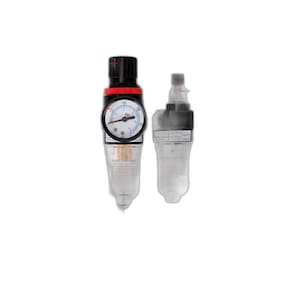 = Modelo: Filtro Eliminador De Água E Lubrificador de Óleo Com Regulador Pressão 1/4'' = Fluido: Ar Comprimido = Rosca de Entrada: 1/4 =rosca de Saída: 1/4 = Pressão de Trabalho: 0 a 10 Bar =vazão a 7 Bar: 1/4 BSP: 2300 L/Min. = Fixação: Suporte Cantoneira = Capacidade do copo: 0,15 L = Corpo: Alumínio = Copo: Policarbonato