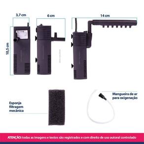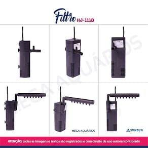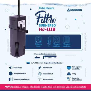 Filtro Sunsun hj-111b interno dupla filtragem com saída comum ou tipo flauta - 200L/h para aquários pequenos de até 40L Os filtros submersos Sunsun, são ideais para quem busca um equipamento prático, de fácil manutenção, confiável e de ótimo custo-benefício, possui saída tipo flauta que auxilia na oxigenação da água, realiza dois tipos de filtragem, biológica e mecânica. Características: Baixo consumo de energia Dupla filtragem Filtro esponja propicia o crescimento de bactérias para filtragem biológica e mecânica Silencioso Resistente Fácil instalação, limpeza e manutenção Possui ventosas para fixação Refil de fácil Ótimo custo benefício Saída tipo chuveirinho que auxilia na oxigenação da água Acompanha mangueira de ar para auxílio na oxigenação Acompanha dois bicos de saída: comum e saída flauta O filtro necessita ficar totalmente submerso Especificações técnica: Marca: Sunsun Modelo: Sunsun hj-111b Potência: 2W Vazão: 200 L/h Hmax: 45cm altura máxima que a bomba consegue elevar a água Indicado para aquários de até: 40L Medidas: 3,7 x 10,5 x 6cm larg x alt x profund Altura total com a flauta: 13cm. Comprimento da flauta: 11,5cm Tamanho do fio: 140 cm Peso: 147g Itens inclusos na embalagem: 1 Bomba Sunsun 1 Filtro com esponja 1 Bico de saída de água comum 1 Saída de água tipo flauta / chuveirinho 1 Mangueira de ar silicone 1 Manual em português Manutenção: Realizar a limpeza da bomba e das esponjas a cada 7 dias. Obrigado pela visita e boas compras ATENÇÃO Nossas imagens e textos são registrados e com direito de uso autoral controlado e reservado a essa loja e as lojas parceiras devidamente autorizadas em contrato. Marca: Não Informado