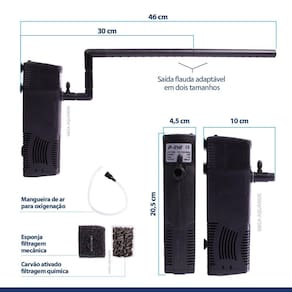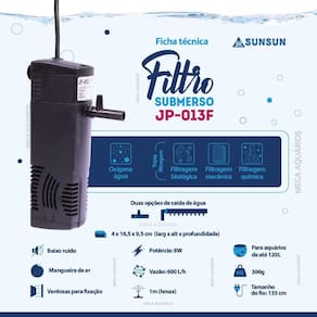 Filtro Sunsun JP-013F interno submerso tripla filtragem com saída comum ou tipo flauta -600L/h para aquários de até 120L Os filtros submersos Sunsun, são ideais para quem busca um equipamento prático, de fácil manutenção, confiável e de ótimo custo-benefício, possui saída tipo flauta que auxilia na oxigenação da água, realiza três tipos de filtragem, biológica, mecânica e química. Características: Baixo consumo de energia Tripla filtragem Filtro esponja propicia o crescimento de bactérias para filtragem biológica e mecânica Carvão ativado filtragem química Auxilia na oxigenação Silencioso Resistente Possui ventosas para fixação Refil de fácil Ótimo custo benefício Acompanha mangueira de ar para auxilio na oxigenação Acompanha dois bicos de saída: comum e saída flauta O filtro necessita ficar totalmente submerso Serve para aquário marinho e de água doce Especificações técnica: Marca: Sunsun Modelo: Sunsun JP-013F Potência: 8W Voltagem: Escolha a voltagem no botão do anúncio Vazão: 600 L/h Hmax: 1m altura máxima que a bomba consegue elevar a água Indicado para aquários de até: 120L Medidas: 4 x 16,5 x 9,5 cm larg x alt x profund Tamanho do fio: 135 cm Peso: 300g Itens inclusos na embalagem: 1 Bomba Sunsun 1 Filtro com esponja e carvão ativado 1 Bico de saída de água comum 1 Bico de saída de água tipo flauta / chuveirinho 1 Mangueira de ar silicone Manutenção: Realizar a limpeza da bomba e das esponjas a cada 7 dias. Trocar o carvão ativado a cada 30 dias. Obrigado pela visita e boas compras ATENÇÃO Nossas imagens e textos são registrados e com direito de uso autoral controlado e reservado a essa loja e as lojas parceiras devidamente autorizadas em contrato.