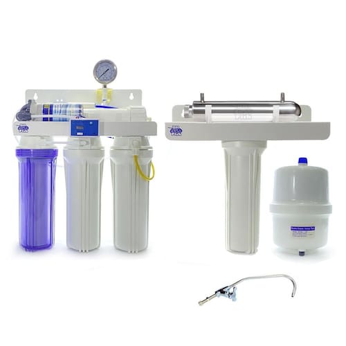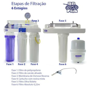 Filtro Osmose Reversa super completo, com estágios 6 de fitragem e o diferencial do ultra violeta e absluto 0,22. Produz água extremamente pura para uso em farmácias, laboratórios e hospitais.