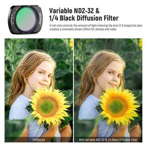 - ?Filtro multifunção? Este filtro combina efeitos variáveis ND e difusão preta 1/4. Ele não apenas controla a quantidade de luz que entra na lente (1-5 paradas), mas também cria um efeito de sonho cinematográfico para fotos e vídeos. O efeito de difusão preto 1/4 suaviza os destaques e reduz os reflexos, produzindo um visual cinematográfico fantástico