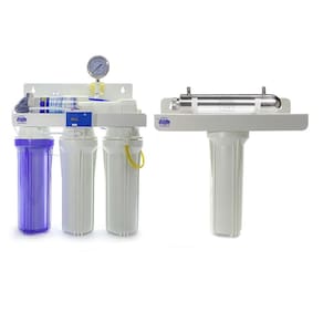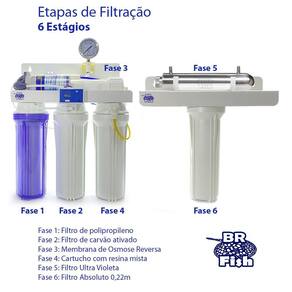 Filtro Osmose Reversa super completo, com estágios 6 de fitragem e o diferencial do ultra violeta e absluto 0,22. Produz água extremamente pura para uso em farmácias, laboratórios e hospitais.