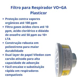 Filtro para Respirador VO+GA Plasticor Proteção contra Vapores Orgânicos e Gases Ácidos Segurança avançada para ambientes com contaminantes químicos O Filtro VO+GA da Plasticor é composto por cartucho, grade interna e tampa externa em poliestireno, com duas camadas de papel Viledon envolvendo carvão ativado. Projetado para uso em sistemas de respiração por cartucho, ele oferece barreira eficiente contra vapores orgânicos e gases ácidos em concentrações controladas.