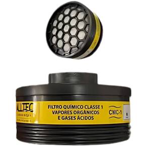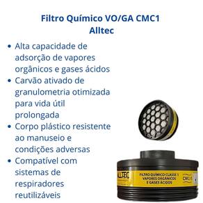 Filtro Químico VO/GA CMC1 Alltec Proteção avançada contra vapores orgânicos e gases ácidos O cartucho químico Alltec CMC-1 é projetado para filtrar vapores orgânicos (VO) e gases ácidos (GA) em concentrações de até 1 000 ppm para solventes orgânicos e 50 ppm para ácido clorídrico e dióxido de enxofre. Seu núcleo de carvão ativado granulado proporciona purificação eficiente do ar em ambientes industriais.