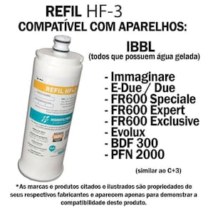 Filtro Refil Compatível IBBL C+3 Natural Due FR600 Immaginare Filtro Refil HF+3 Purificadores de Água IBBL Modelos que possuem água gelada:- Immaginare- Due- E-Due- FR600 Speciale- FR600 Expert- FR600 Exclusive- Evolux- BDF 300- PFN 2000 Filtro equivalente ao refil C+3. Fazer a troca do filtro é realmente muito simples e leva cerca de 3 minutos. É só girar e trocar. As orientações de como fazer a troca vão no filtro. O filtro deve ser trocado a cada 6 meses, ou antes, caso estime que seja consumido 4000 litros em menos de 6 meses. O filtro remove o cloro da água, elimina sabores, retém partículas de sujeira, barro, ferrugem, eleva o Ph, além de ter ação bacteriostática. As marcas e produtos citados e ilustrados são propriedades de seus respectivos fabricantes e aparecem apenas para demonstrar a compatibilidade deste produto. --------------------------------------------------------------------------- Fabricante/marca do refil: HidrofiltrosModelo do produto: HF+3Eficiência da retenção de partículas: Classe IIIEficiência da redução de Cloro livre: AprovadoEficiência bacteriológica: não se aplica Produto de acordo com a norma ABNT NBT 16098:2012. Elemento filtrando destinado ao uso em água que atenda a portaria N 2.914 do Ministério da Saúde.