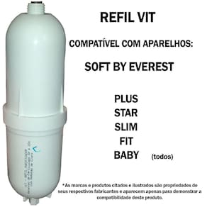 Filtro refil compatível com purificadores de água Soft by Everest. Compatível com modelos Plus, Star, Slim, Fit e Baby. Equivalente ao refil 2 em 1. Remove cloro, elimina sabores, retém partículas de sujeira, barro e ferrugem, e ajuda a elevar o pH. Eficiência da retenção de partículas: classe iii. Eficiência da redução de cloro livre: aprovado. Produto de acordo com a norma ABNT NBT 16098:2012.Tipo