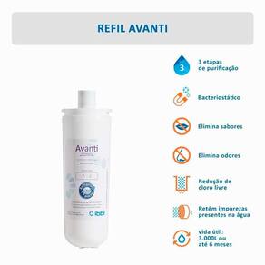 Filtro refil girou trocou avanti ibbl Filtro refil girou trocou avanti ibbl O refil girou trocou avanti possui o sistema de tripla filtração: retém partículas e areia, barro, sedimentos e reduz o cloro existente na água. Promovendo controle do nível microbiológico. Prático sistema refil girou trocou garante ao usuário uma fácil do refil.Este refil é exclusivo para os purificadores de água natural mio e avanti. Filtro refil girou trocou avanti ibbl Características gerais : Produtos compatíveis: avanti e mio Vida útil 2.000 l ou até 6 meses 3 etapas de filtragem Eficiência de redução de cloro Bacteriostático: controla a proliferação de bactérias Elimina odores Elimina sabores Troque sem fechar o registro Marca: Wds