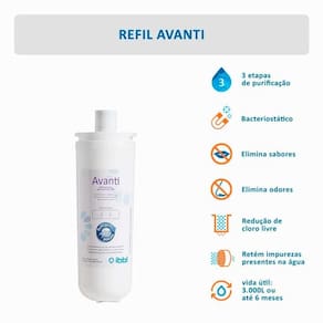 Filtro refil girou trocou avanti ibbl Filtro refil girou trocou avanti ibbl O refil girou trocou avanti possui o sistema de tripla filtração: retém partículas e areia, barro, sedimentos e reduz o cloro existente na água. Promovendo controle do nível microbiológico. Prático sistema refil girou trocou garante ao usuário uma fácil do refil.Este refil é exclusivo para os purificadores de água natural mio e avanti. Filtro refil girou trocou avanti ibbl Características gerais : Produtos compatíveis: avanti e mio Vida útil 2.000 l ou até 6 meses 3 etapas de filtragem Eficiência de redução de cloro Bacteriostático: controla a proliferação de bactérias Elimina odores Elimina sabores Troque sem fechar o registro Marca: Não Informado